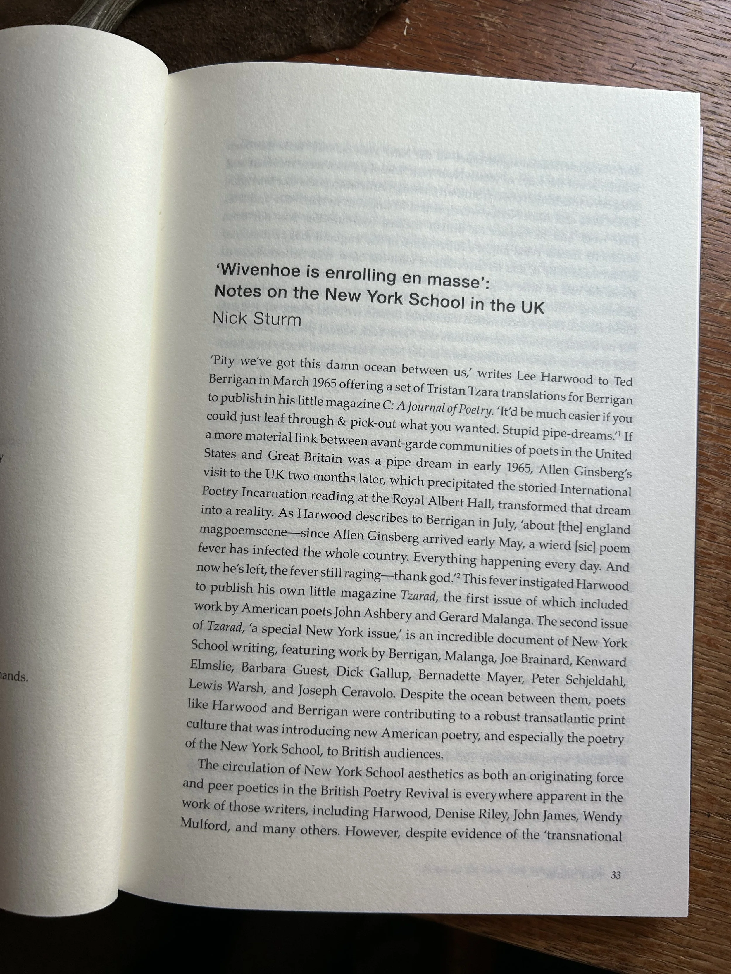 “‘Wivenhoe is enrolling en masse’: Notes on the New York School in the UK,” The Stinging Fly, May 2022: https://drive.google.com/file/d/110Y2Jgb6fwClTQ12NlHdsLOxQsOJvcw-/view