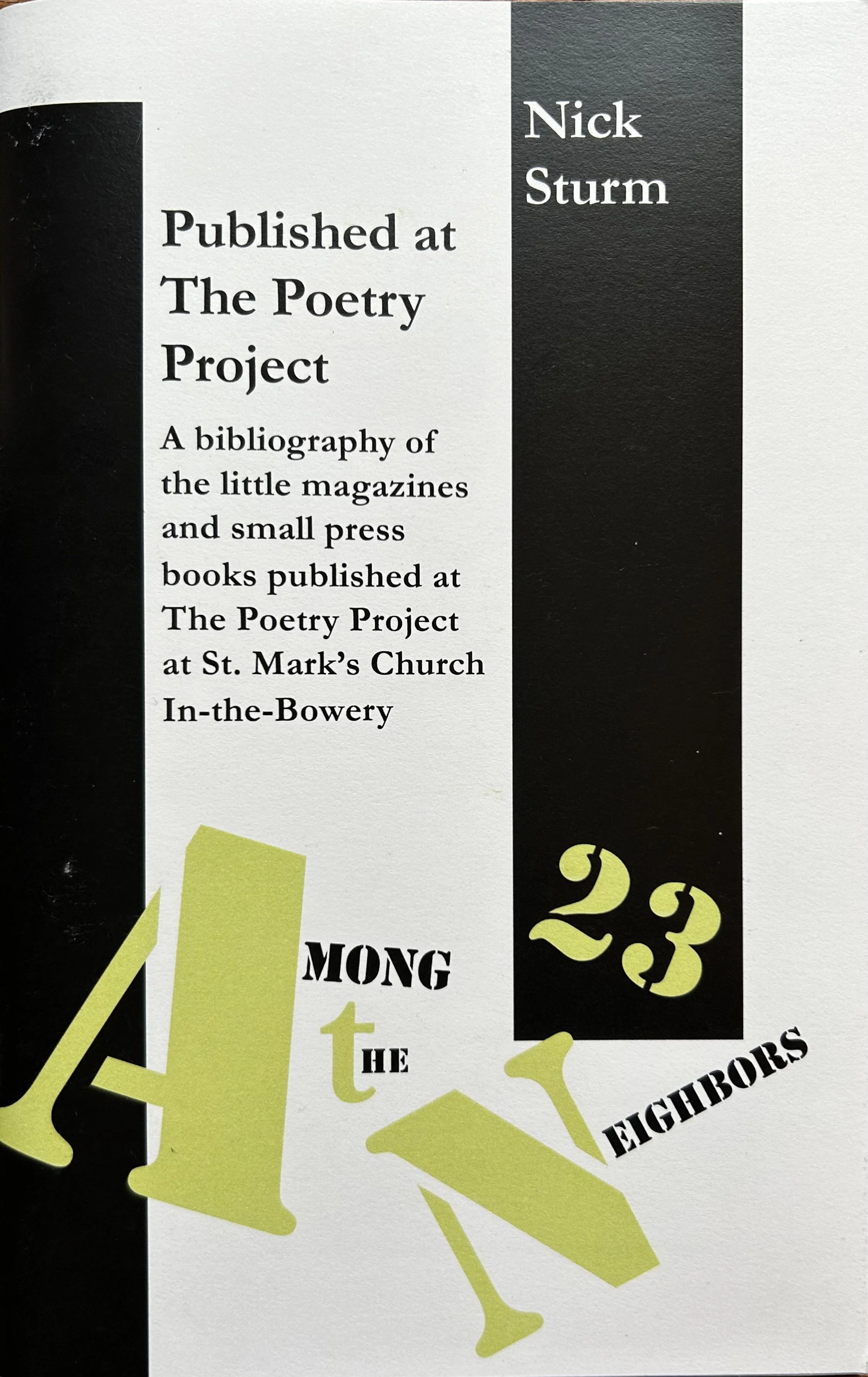 Published at The Poetry Project: A bibliography of the little magazines and small press books published at The Poetry Project at St. Mark’s Church In-the-Bowery, “Among the Neighbors” bibliographic pamphlet series, no. 23, University at Buffalo, Nov. 2022.