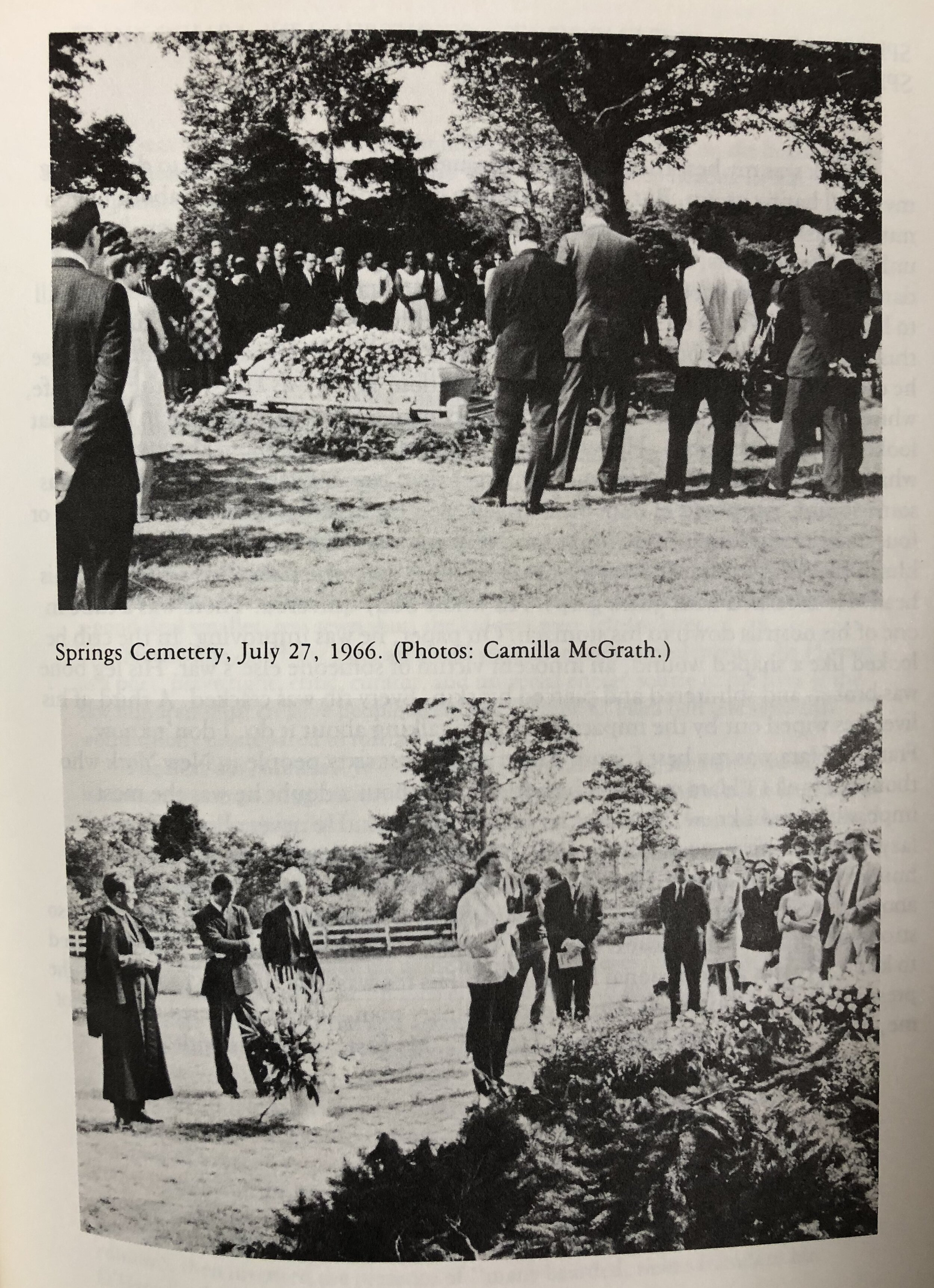 Below: Two photographs of O’Hara’s funeral service at Green River Cemetery on page 137 in Homage to Frank O’Hara. In the bottom image, one can identify—from left to right—Bill Berkson (in a suit, arms crossed, looking down), Edwin Denby, Larry Rivers reading his famous eulogy described above by Brodey, and John Ashbery in sunglasses with his hands folded in front of him.